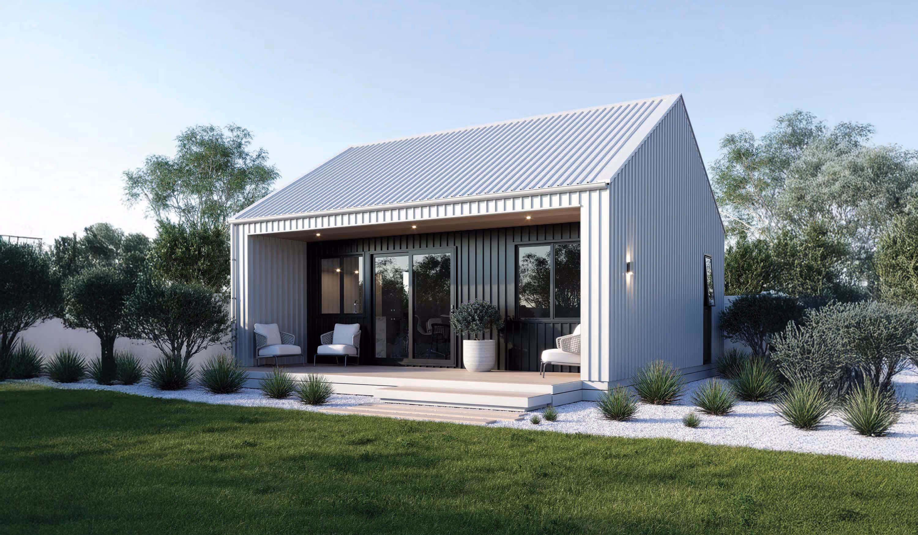 Enjoy timeless elegance with our gable roof granny flat, featuring a metal roof and wall cladding with contrastingextrusions for a stylish covered outdoor living space. Inside, you'll find one bedroom, a bathroom, and an open-planliving, kitchen, and dining area. This granny flat combines classic design with modern functionality, making it a perfectaddition to any property.