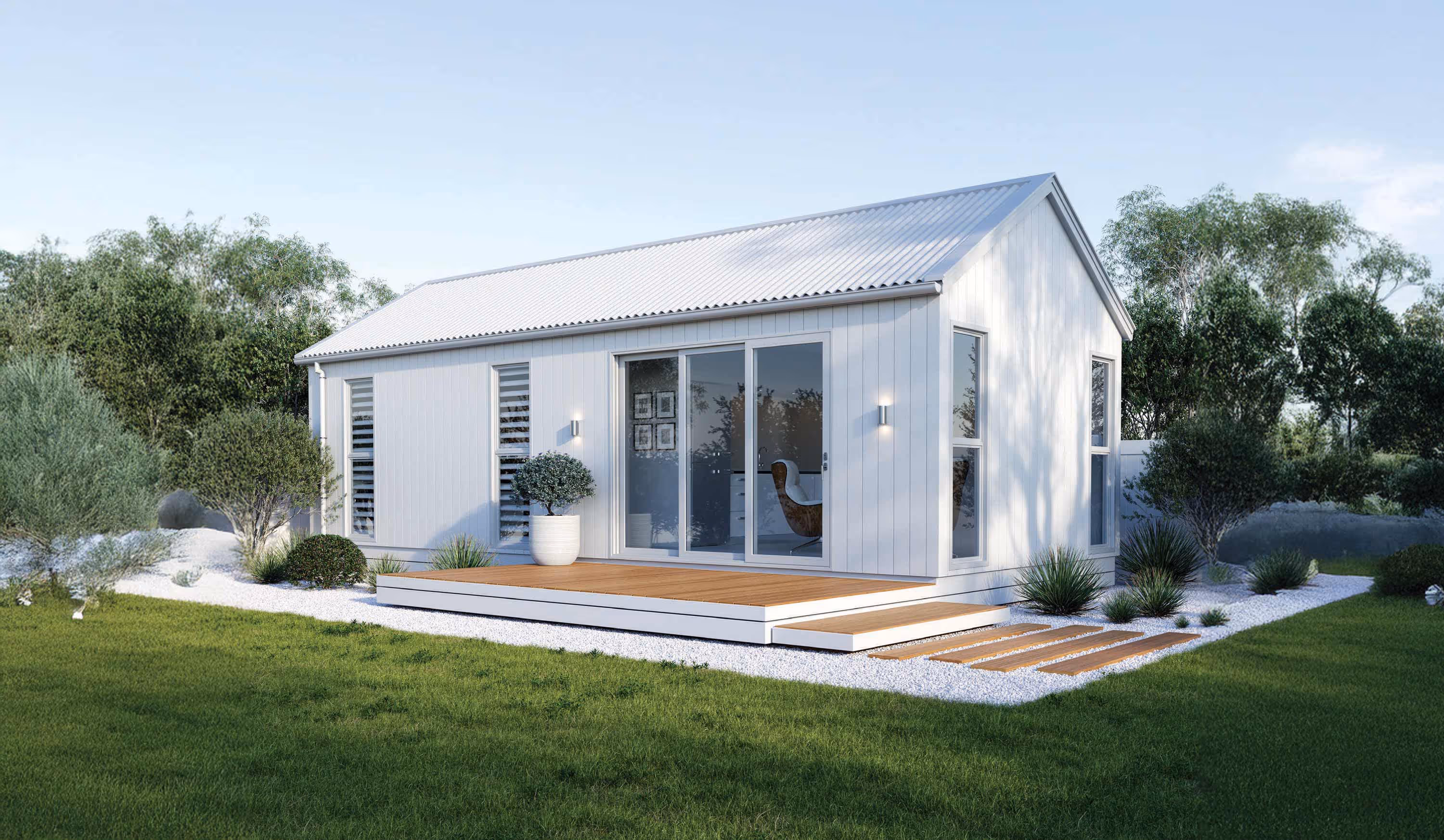 Step into timeless charm with our classic gable roof granny flat, featuring vertical cladding with a pristine paint finish. This one-bedroom design includes an open-plan living, dining, and kitchen area, a bedroom with a study nook, a spacious bathroom with easy access, and a convenient laundry nook. The deck provides a perfect space for outdoor relaxation, making this granny flat a stylish and functional addition to your property.